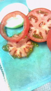 2)トマトも輪切りにして、種の部分を切り抜きます。