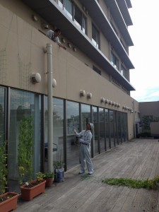 ネットは上の階から吊るしています 飛ばないようにブロックで重石